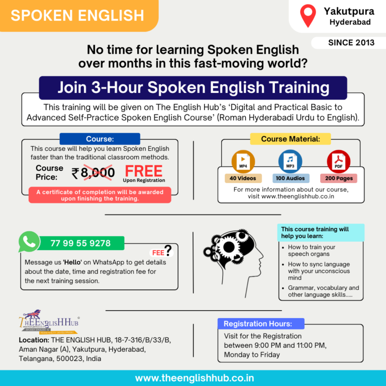 Join The English Hub for an engaging 3-hour Spoken English training session. This session will introduce you to our Digital & Practical Basic to Advanced Self-Practice Spoken English Course, designed to help you practice and improve your English skills every day at home.